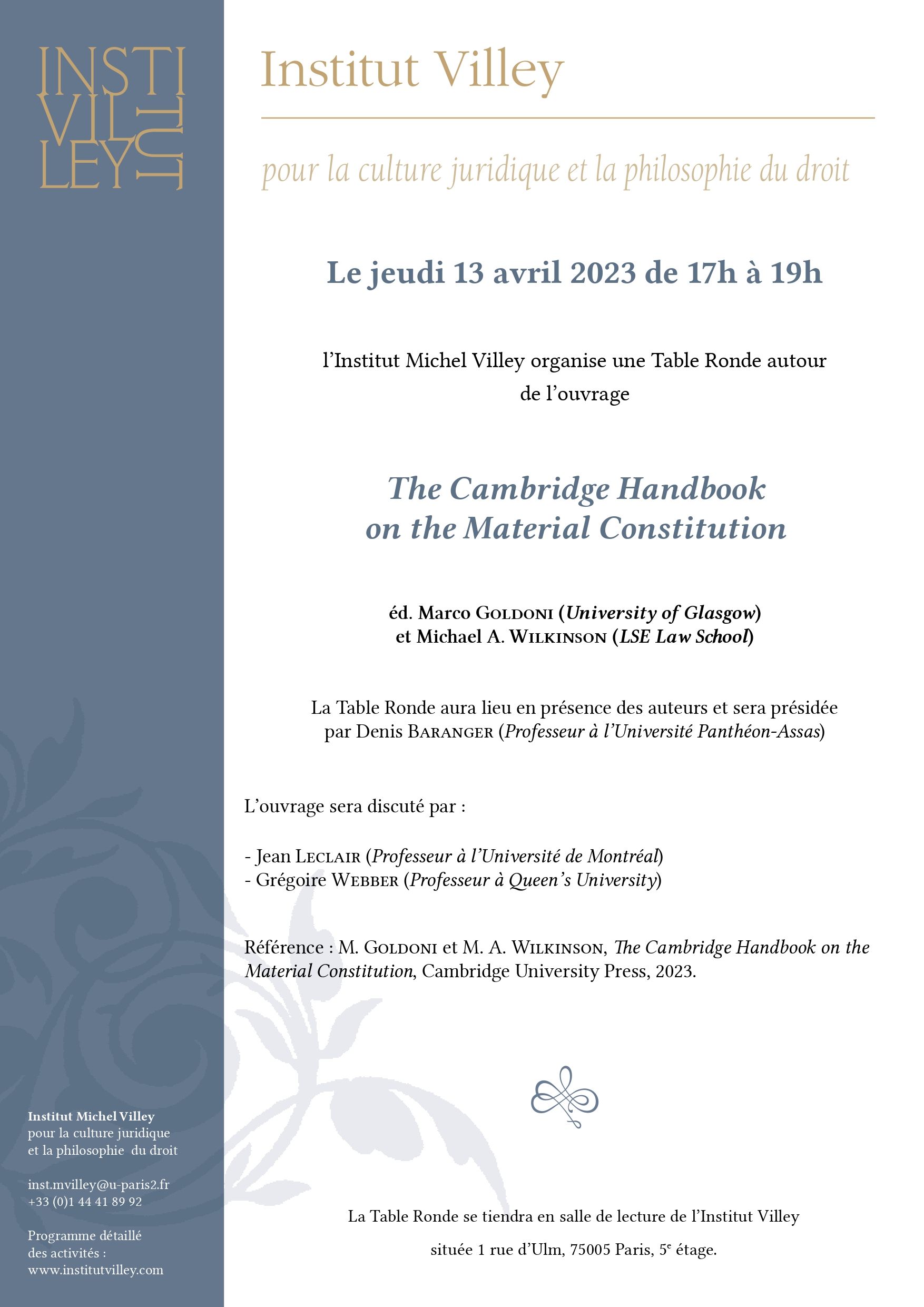 L’Institut Michel Villey organise une table ronde autour de l’ouvrage "The Cambridge Handbook on the Material Constitution" - éd. Marco GOLDONI (University of Glasgow) et Michael A. WILKINSON (LSE Law School) - le jeudi 13 avril à 17h.