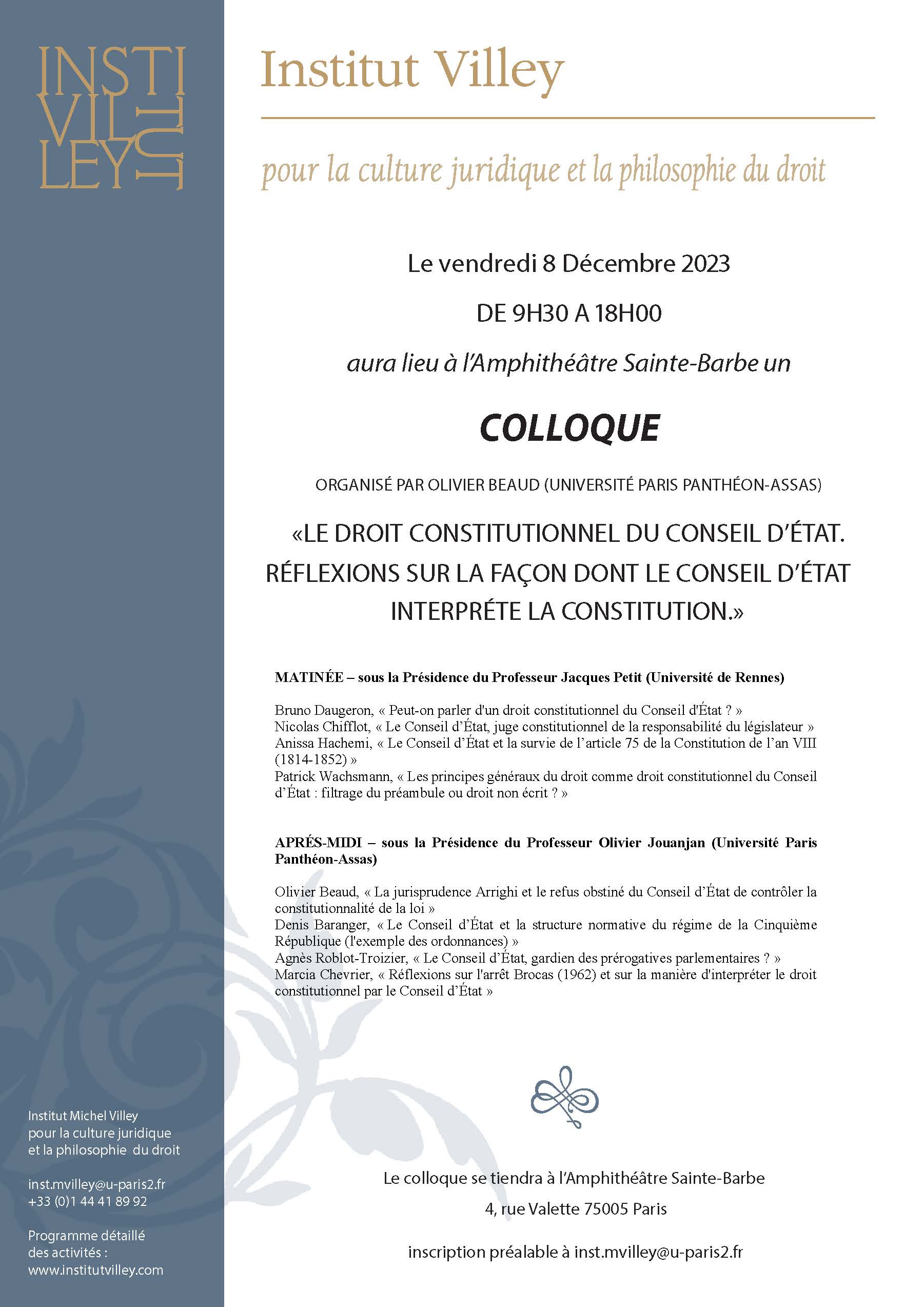 L’Institut Villey organise un colloque intitulé "Le droit constitutionnel du Conseil d’État. Réflexions sur la façon dont le Conseil d’État interprète la constitution" le vendredi 8 décembre, organisé par Olivier BEAUD.