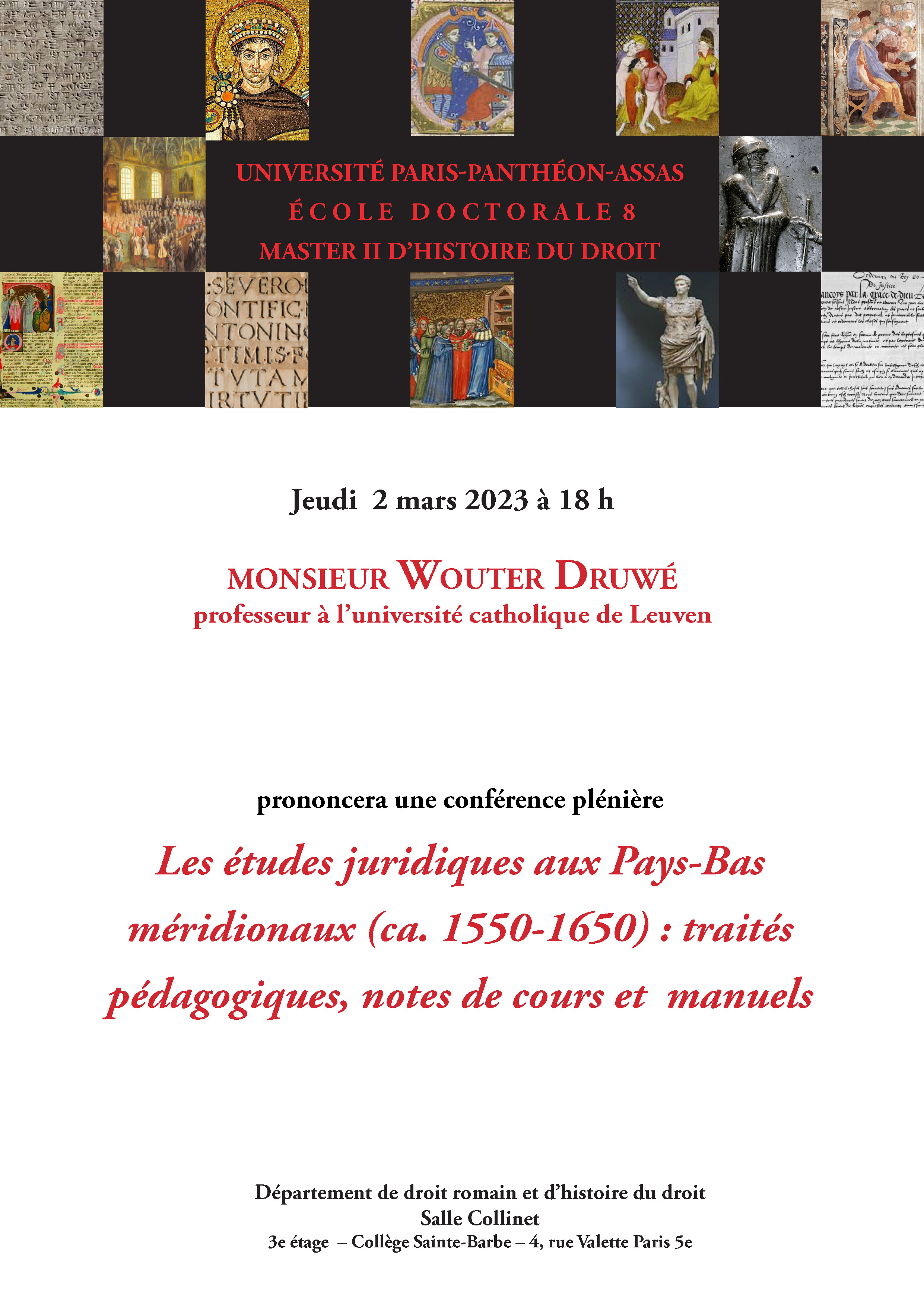Wouter DRUWÉ, professeur à l’université catholique de Leuven prononcera une conférence plénière « Les études juridiques aux Pays-Bas méridionaux (ca. 1550-1650) : traités pédagogiques, notes de cours et manuels » le jeudi 2 mars à 18h.