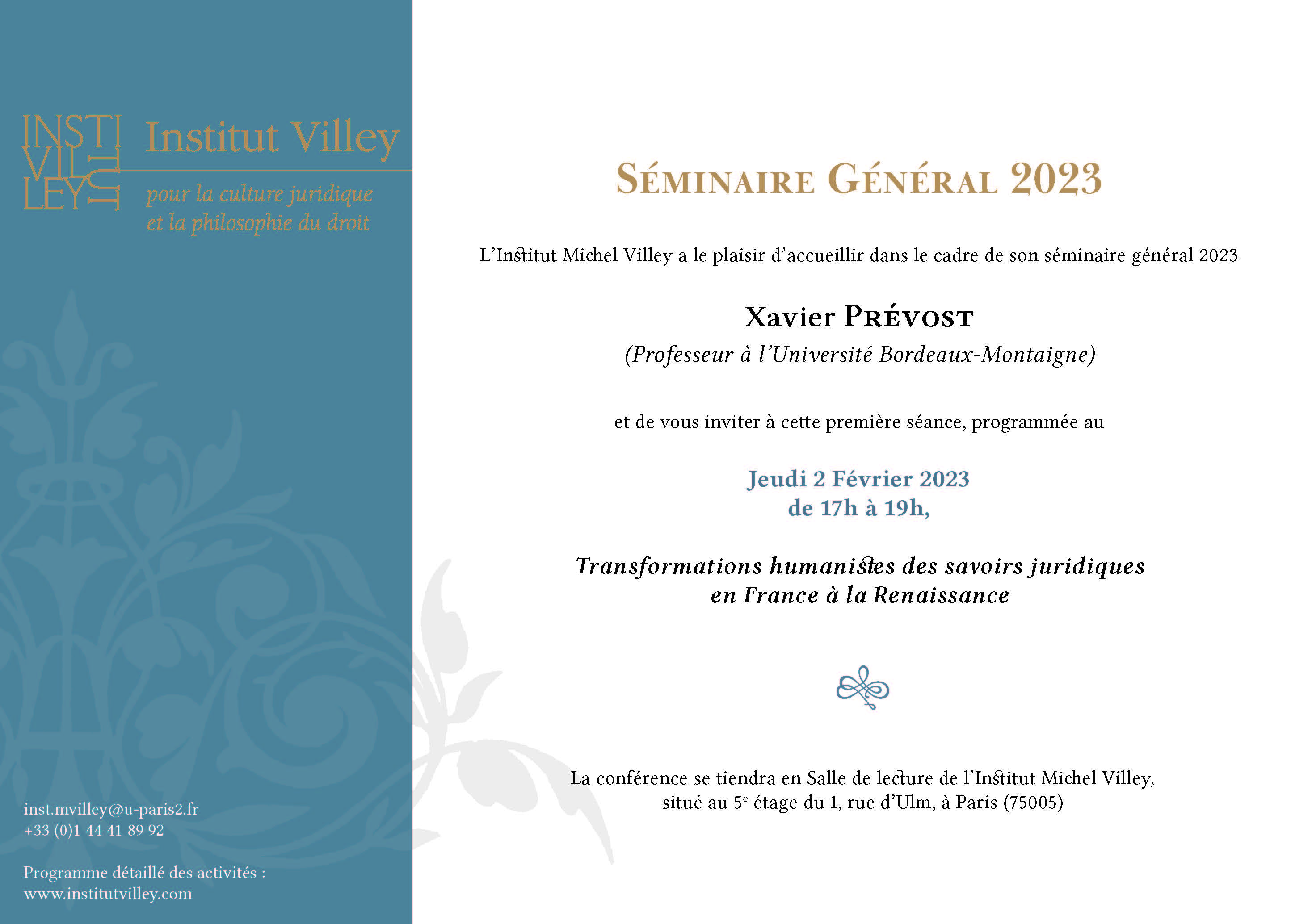 Dans le cadre du séminaire général de l'Institut Villey, Xavier PRÉVOST, professeur à l’Université Bordeaux-Montaigne donnera une conférence le jeudi 2 février à 17h, sur le thème : Transformations humanistes des savoirs juridiques en France à la Renaissance.